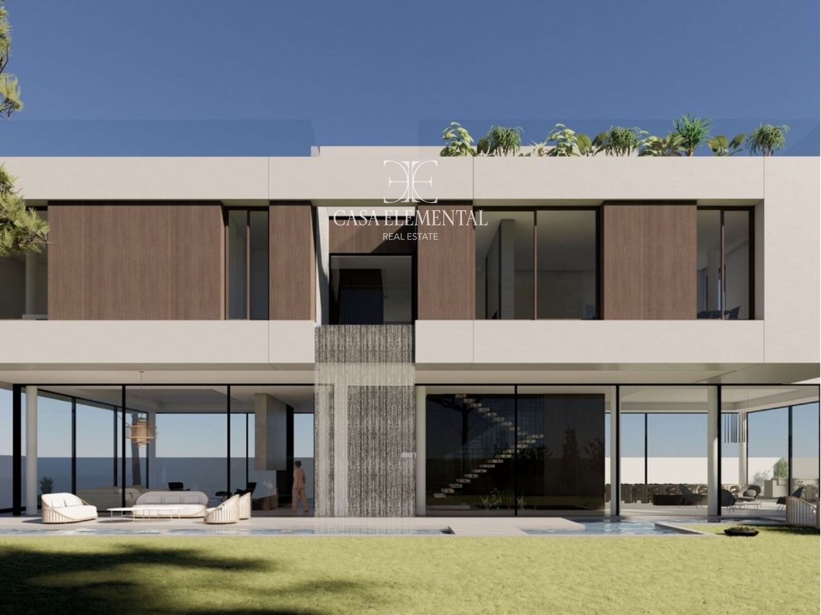 The property includes a remarkable percorso of waterfalls, water sheets, and pools that embrace the residence, creating a one-of-a-kind oasis.