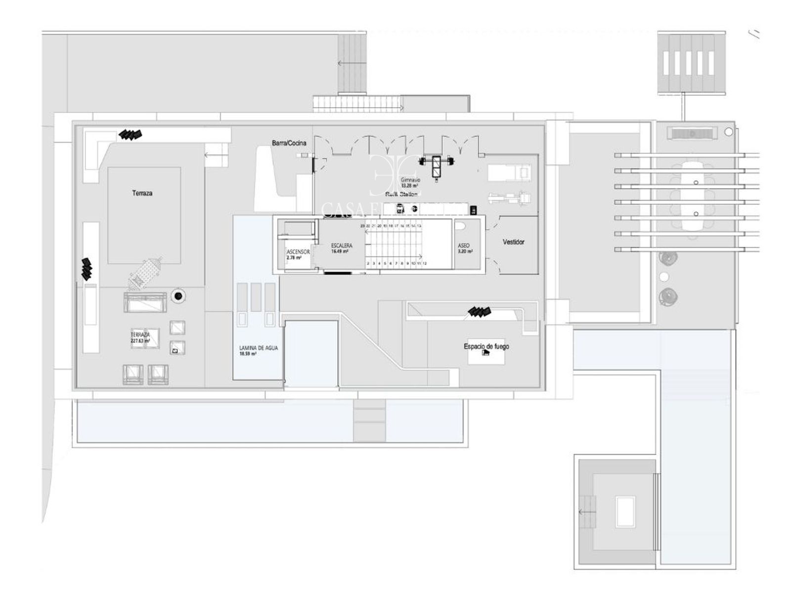 A spectacular chill-out terrace marks the starting point of the home's iconic water features, accompanied by a fully integrated gym.